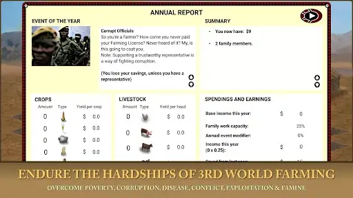3rd World farmer is an independently developed serious game. It simulates some of the real-world mechanisms that cause and sustain poverty in 3rd World countries. While the simulation is not precise in every detail, it does cover a wide range of topics related to poverty.