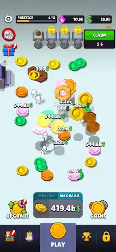 PRESTIGE FOR MASSIVE GAINS Reach the top and hit the Prestige button! Reset your progress to gain huge permanent multipliers and bonuses. Each prestige propels your earning potential to new heights, allowing you to earn billions and trillions faster than ever before.
