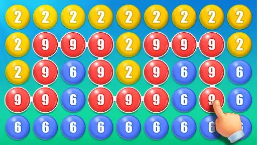 ⁃ Slide to Merge: Connect bubbles with the same number by sliding them in any direction—up, down, left, right, or even diagonally.