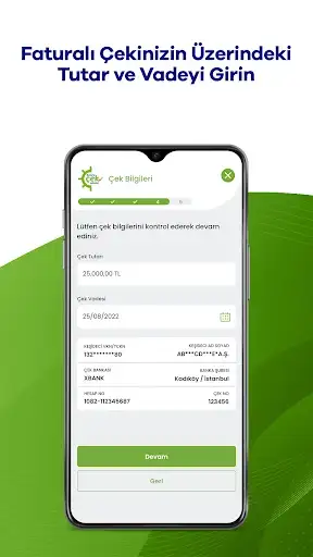 • Faktoring işlemi faturasız yapılamadığı için doğruluğundan emin olduğunuz faturalı çekinizin fotoğraflarını uygulamaya yükleyin ya da karekodu okutun.