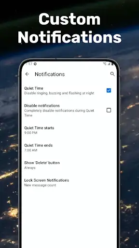 - Custom push notifications for each individual email account, such as the 'Work' email address set to 'Do not Disturb' mode from 21:00 to 7:00 p.m.