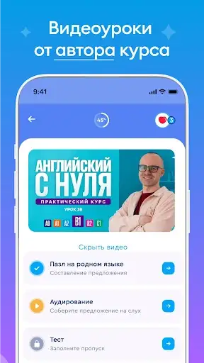 Наш авторский курс состоит из 6 разделов, где представлены уроки для обучения английскому языку с нуля, так и для продвинутого уровня. Уровни английского языка в приложении соответствуют международной шкале: