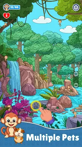 Search the picture, spot the hidden pet, tap to reveal it, and move to the next challenge. Levels