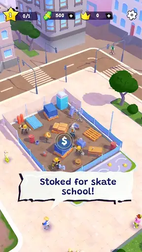 - Casual idle tycoon gameplay with a colorful skate city setting
