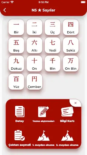 • 5 Kanji seviyesi: N5, N4, N3, N2, N1, seviyenizi seçmenize imkan sağlar.