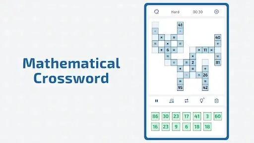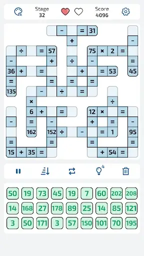This math puzzle has four difficulty levels: easy, medium, hard and expert. In easy and medium modes there are addition and subtraction operations. And in complex and expert, multiplication and division operations are added to them. Difficulty also affects the size of the numbers that make up a mathematical crossword puzzle and the number of empty cells in it. The size of the numbers increases gradually from easy mode to expert mode. Moreover, complexity also affects the length of the problems: there are mathematical problems consisting of three numbers (1 + 2 = 3), and others of five (1 + 2 + 3 = 6). The selected difficulty also affects the number of mathematical problems that make up the level of a mathematical crossword puzzle. For example, in the easy level the level will consist of 6 – 12 mathematical problems, and in the expert mode the level will consist of 18 – 23 mathematical problems. Therefore, everyone will be able to choose a level that will correspond to their mathematical and mental abilities, both beginners and advanced users, both those starting their journey in mathematics and already experienced players , both elementary school students and high school students or even university students.