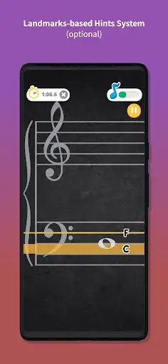 Note Rush features a unique landmarks-based hints system (optional) that highlights nearby landmark notes to read intervallically from. Over time students naturally move from reliance on landmarks to a more intrinsic staff-to-keyboard association.