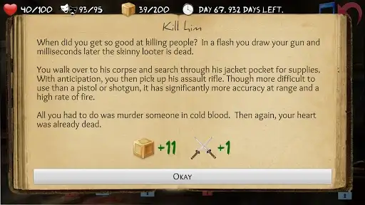 + There are 1000s of unique and professionally written events to encounter and even more tough decisions to make! All decisions have consequence; small decisions early in the game can have profound effects later! Meet other survivors and help or exploit them. Plenty of moral decisions will question how far you would go to survive and affect your final score... can you survive without losing yourself?
