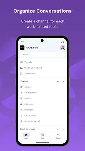 • Create public and private channels to organize and discuss work topics