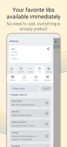 ✓ Hobbyists: Rich packages support and offline interpreter allow you to write games and also programs using device sensors like camera. Use the power of Python combined with mobility of your device for your hobby coding projects