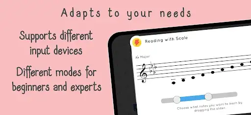 o Smart mode: let yourself be guided with our complete learning program available in four different clefs (bass clef, treble clef, alto clef and tenor clef). Ideal for beginners, learning begins with three notes and offers progressive difficulty that adapts to the player's progress. So move forward at your own pace.