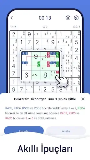 Bir düzineden fazla ortak Sudoku problem çözme becerisi de dahil olmak üzere güçlü akıllı ipuçları geliştirdik. Tüm Sudoku bulmacalarımız bu becerilerle çözülebilir ve çözülemeyecek bir durum olmayacaktır.