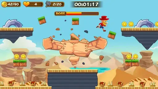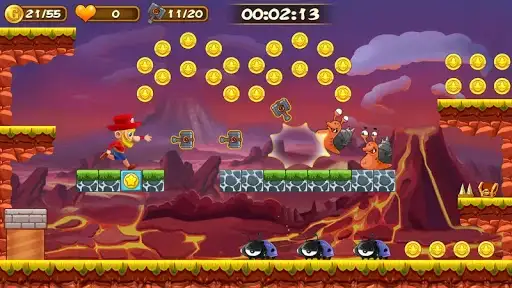 Run, jump and explore the arcades. Travel across dangerous forest, volcano, desert, swamps, machine room, etc. Collect coins, gold, hammers to help you defeat the Monster!