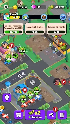 Terminaller, benzin istasyonu ve daha fazlasını kur. Yolcularını mutlu et ve havalimanının gelişimini izle!
