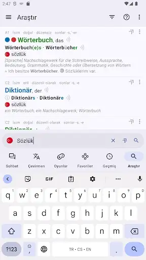 ▸ Kelime arayın → örnekleri görün → sohbette pratik yapın