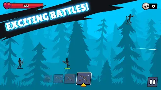Try all the weapons and find your favorite to win every stickman war. Throwing attack with objects, earn coins, chests, and diamonds, equip the stickman with new armor, powerful spells and go into battle to shoot down opponents.