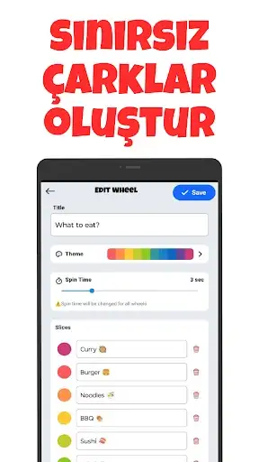 Bu gerçekten rastgele çarkla olasılıklar sonsuzdur. Farklı senaryolar için birden fazla tekerlek oluşturun, favori kurulumlarınızı hızlı ve kolay erişim için kaydedin ve yaratımlarınızı arkadaşlarınızla ve ailenizle paylaşın. İster kişisel ikilemler, profesyonel kararlar, ister eğitim faaliyetleri için kullanıyor olun, bu karar döndürücü en iyi arkadaşınızdır.