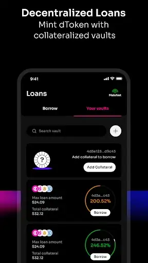 Unlock more financial potential with trust-less decentralized loans and access dTokens with collateralized vaults on the blockchain. Gain access to collateral tokens at a great value by participating in auctions for liquidated vaults.