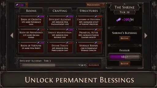 - Obtain favour, and upgrade the Shrine over time to receive permanent blessings which have a lasting impact on every character.