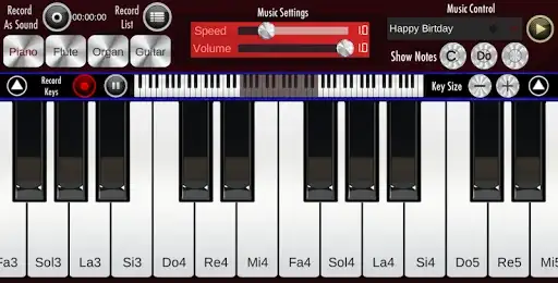 Çaldığınız enstrumanı kaydetip sonra tekrar dinleyebilirsiniz. Artı ve Eksi tuşları ile piyanonun boyutunu ayarlayabilirsiniz.