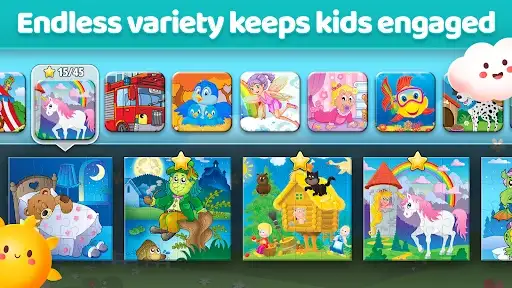 En çok indirilen eğitici çocuk uygulamalarından biri olan Kids Puzzles el yapımı, göz alıcı, orijinal birçok görselden oluşur. Çocuklar bulmacayı tamamladığında oyun onları muhteşem başarılarından dolayı tebrik eder ve küçük sarı bir yıldız verir. Zamanla çocuk başarıdan hoşlanmaya başlar ve pozitif güç kazanır. Öğrenmeye ve oynamaya devam etmek ister.