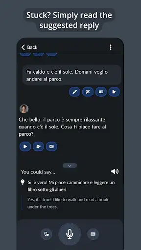- Speak your native language when stuck: Can't find the right word? Switch languages mid-conversation and the AI will help you learn the phrase.