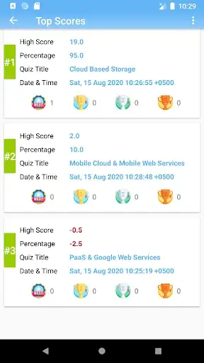 After attempting a MCQ Quiz, user can view the summary report with appropriate reward, detailed reports, top scores with number of different award wins. User can also clean-up the quiz reports, if needed.