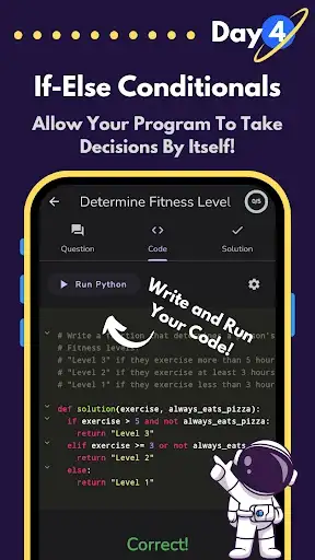 - Conditions: if, else, elif, boolean values, comparison, and logical operators.