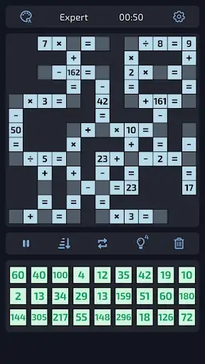 This math puzzle has four difficulty levels: easy, medium, hard and expert. In easy and medium modes there are addition and subtraction operations. And in complex and expert, multiplication and division operations are added to them. Difficulty also affects the size of the numbers that make up a mathematical crossword puzzle and the number of empty cells in it. The size of the numbers increases gradually from easy mode to expert mode. Moreover, complexity also affects the length of the problems: there are mathematical problems consisting of three numbers (1 + 2 = 3), and others of five (1 + 2 + 3 = 6). The selected difficulty also affects the number of mathematical problems that make up the level of a mathematical crossword puzzle. For example, in the easy level the level will consist of 6 – 12 mathematical problems, and in the expert mode the level will consist of 18 – 23 mathematical problems. Therefore, everyone will be able to choose a level that will correspond to their mathematical and mental abilities, both beginners and advanced users, both those starting their journey in mathematics and already experienced players , both elementary school students and high school students or even university students.