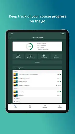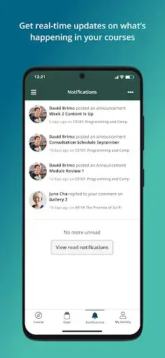Track your progress, view course happenings and stay up-to-date with notifications for courses that you are enrolled in. Every course you complete will provide you with new skills, potential career advancement opportunities, and connect you to more and more people that share your interests.