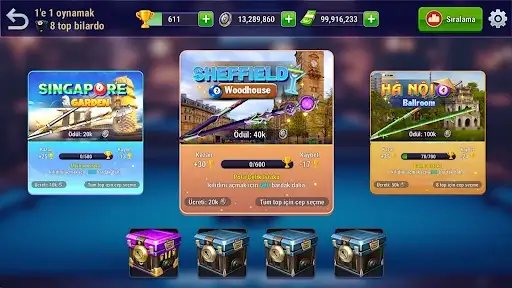 Her seviyeye uygun farklı oyun modlarıyla 8 ball pool (8-ball) ve 9 ball pool (9-ball) arasında özgürce seçim yap. İster antrenman yap, ister akıllı yapay zekâ rakiplere meydan oku ya da dünyanın dört bir yanından oyuncularla heyecanlı çevrimiçi bilardo maçlarına katıl.
