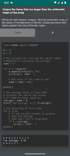 Examples of exception handling, demonstration of the features of object-oriented programming in Python, examples of list comprehension.