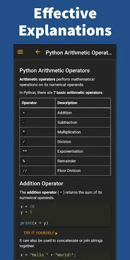 In every lesson, there are explanations, examples with the Try It Yourself functionality that help you effectively learn to code Python.