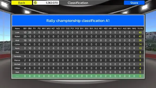 There are 17 racing cars divided by categories. Each car can be upgraded to increase performance and improve your times in the championship.