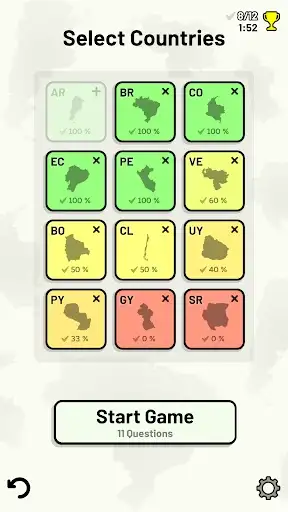 Customizable quizzes allow you to choose which South American countries to test, as well as the topic. Past results for each country are displayed to highlight your progress at each topic.