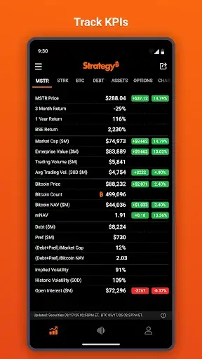 • MSTR KPIs: Stay updated with MSTR’s price movements, volatility, debt offerings, options data, and more.