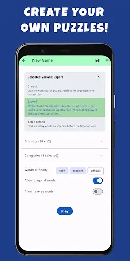 * Create your own puzzles using custom game mode. You have full control over the grid size, word categories, puzzle rules and difficulty level.