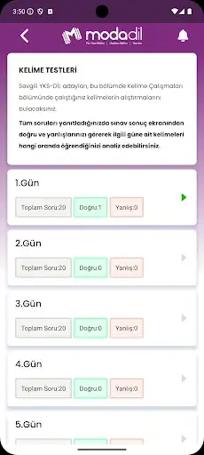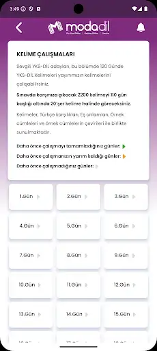 Uygulamada yer alan kelimeleri "Kelime Çalışmaları" altında 110 Gün'de çalışabilirsiniz. İstediğiniz kelimeleri daha sonra gözden geçirmek adına "Öğrenilecekler" arasına ekleyebilirsiniz.